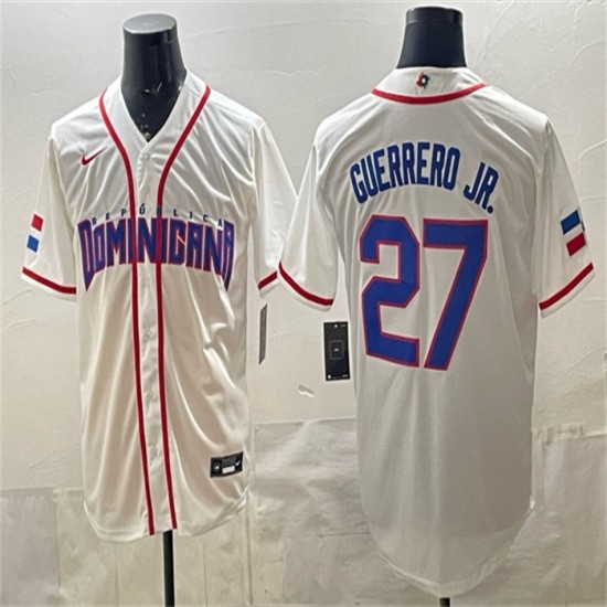 >Men's Dominican Republic Baseball #27 Vladimir Guerrero Jr. White 2026 World Baseball Classic Home Stadium Stitched Jersey