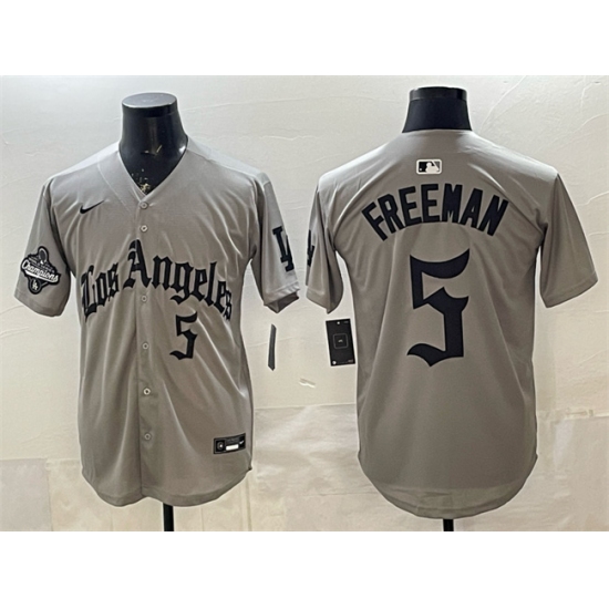 Men's Los Angeles Dodgers #5 Freddie Freeman Grey LA Gothic Style With 2025 World Series Champions Limited Stitched Baseball Jersey