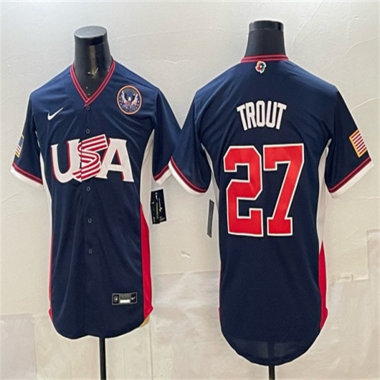 >Men's USA Baseball #27 Mike Trout Navy 2026 World Baseball Classic United States 250th Anniversary Road Stadium Stitched Jersey