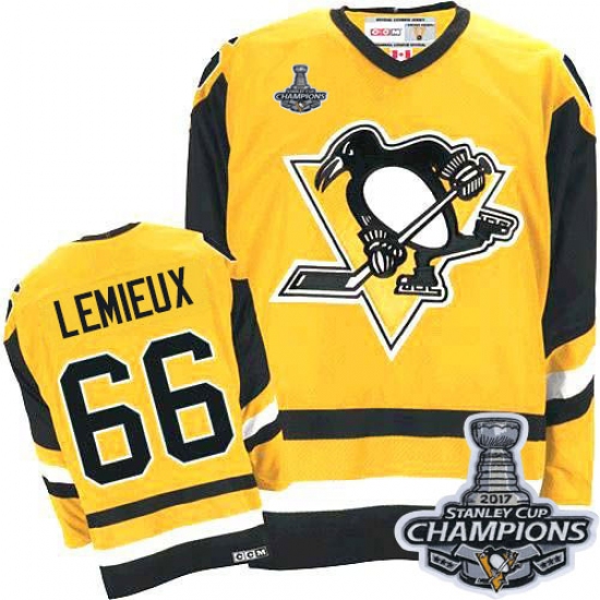Men's CCM Pittsburgh Penguins #66 Mario Lemieux Premier Yellow Throwback 2017 Stanley Cup Champions NHL Jersey