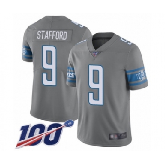 >Men's Detroit Lions #9 Matthew Stafford Limited Steel Rush Vapor Untouchable 100th Season Football Jersey