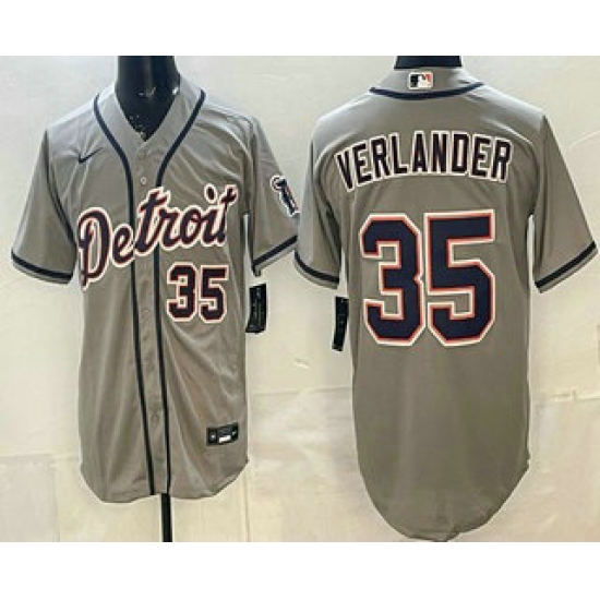 >Men's Detroit Tigers #35 Justin Verlander Grey Number Cool Base Jersey