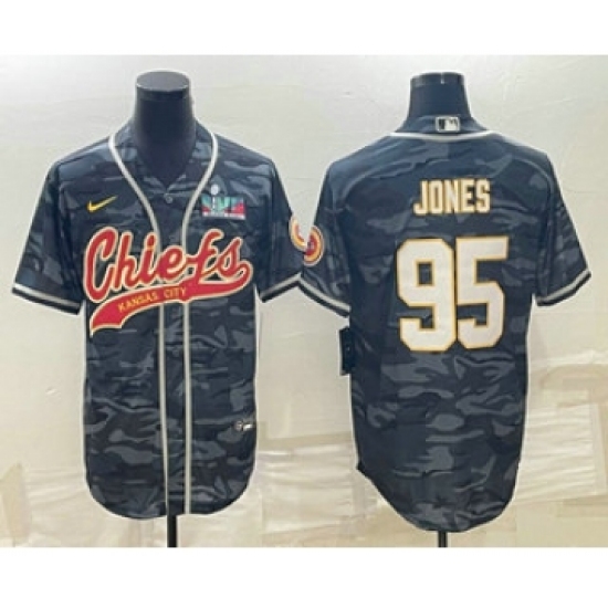 >Men's Kansas City Chiefs #95 Chris Jones Grey Camo With Super Bowl LVII Patch Cool Base Stitched Baseball Jersey