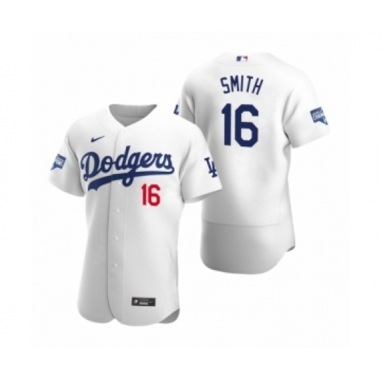 >Men's Los Angeles Dodgers #16 Will Smith White 2020 World Series Champions Authentic Jersey
