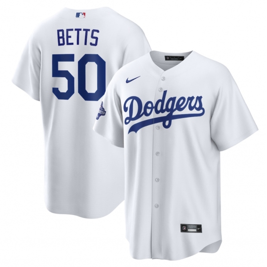 Men's Los Angeles Dodgers #50 Mookie Betts Nike White 2020 World Series Champions Home Patch Replica Player Jersey