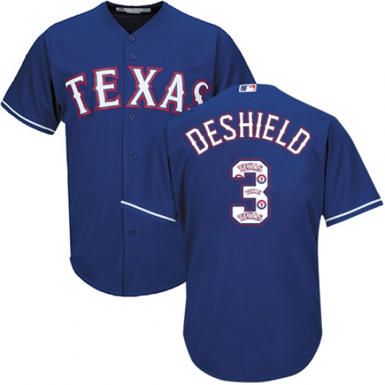 Home>MLB>Texas Rangers>Delino DeShields>Men's Majestic Texas Rangers #3 Delino DeShields Authentic Royal Blue Team Logo Fashion Cool Base MLB Jersey