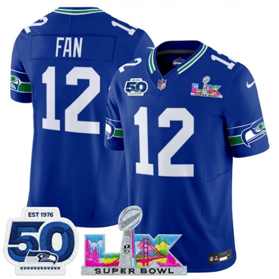 Men's Seattle Seahawks #12 Fan Royal 2025 F.U.S.E. Super Bowl LX And 50th Season Vapor Throwback Limited Football Stitched Jersey