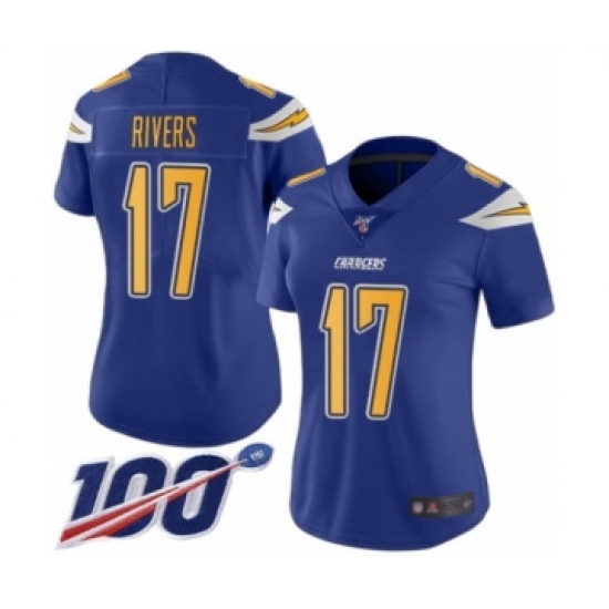 >Women's Nike Los Angeles Chargers #17 Philip Rivers Limited Electric Blue Rush Vapor Untouchable 100th Season NFL Jersey
